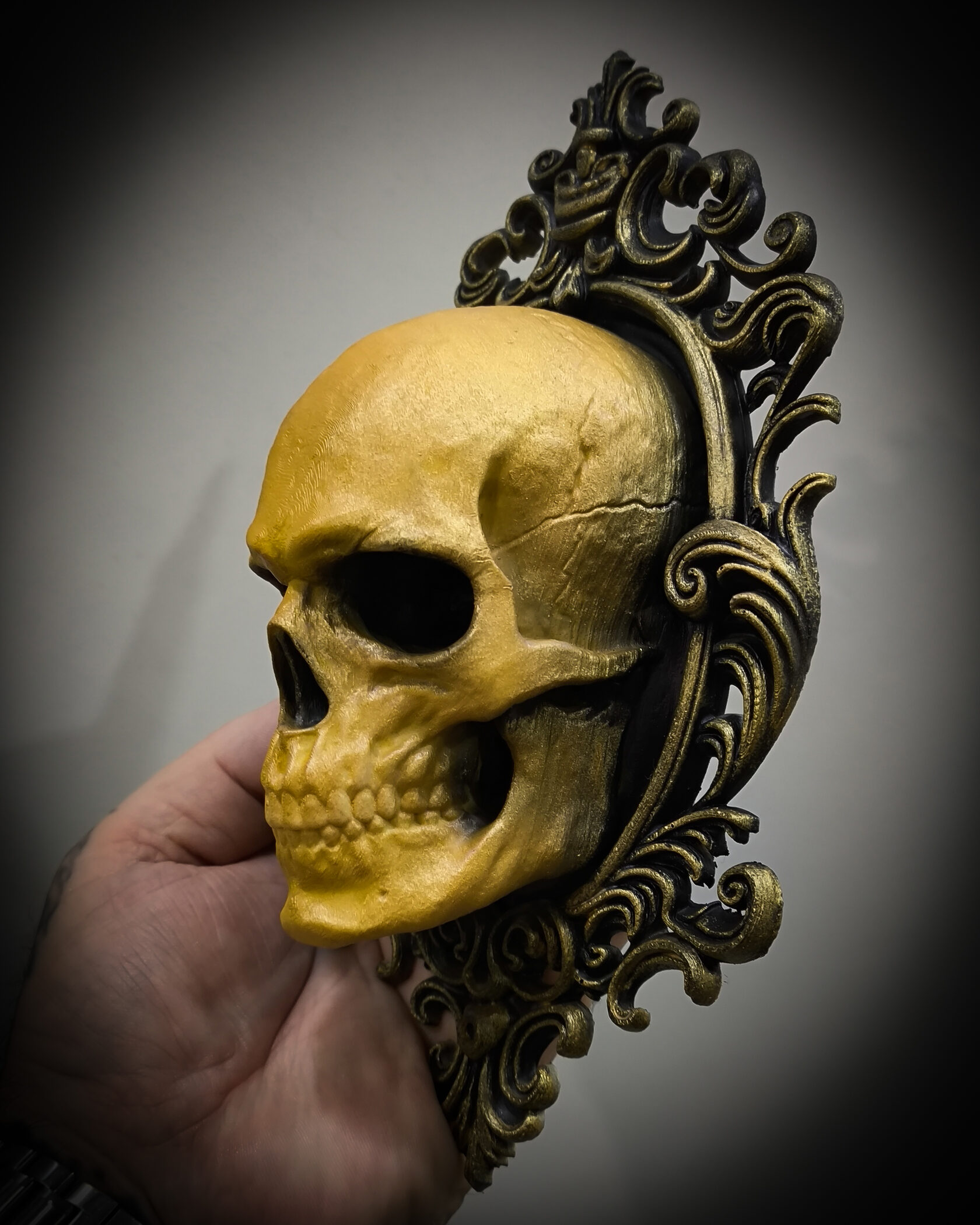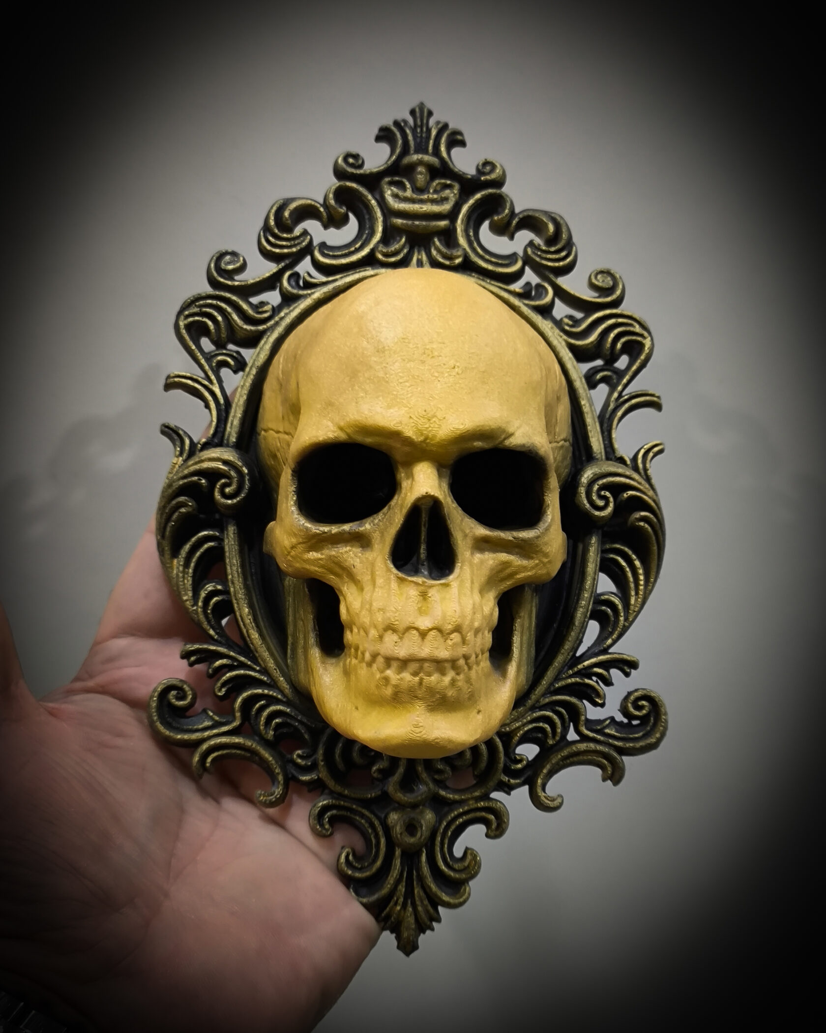 Оригинальное настенное панно в виде черепа, заключённого в изящную барочную раму. Изделие выполнено из прочного литьевого пластика и окрашено вручную, что придаёт каждой работе уникальность.