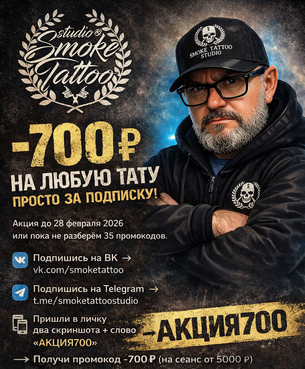 -700 ₽ на любую тату просто за подписку! Акция до 28 февраля 2026 или пока не разберём 35 промокодов.